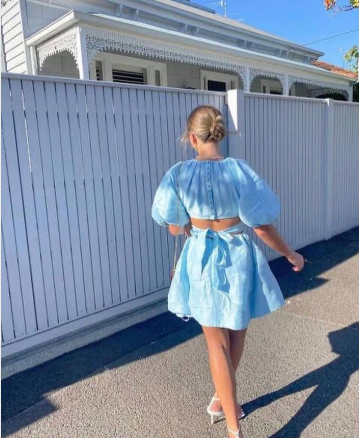 Aje Psychedelia Cut Out Mini Dress in Azure Blue is a statement piece that combines bold design with feminine elegance. Crafted from a luxurious linen-silk blend, this mini dress features voluminous puff sleeves, a wide ruffle waistband with side and back cut-outs, and a self-tie waist for a customizable fit.