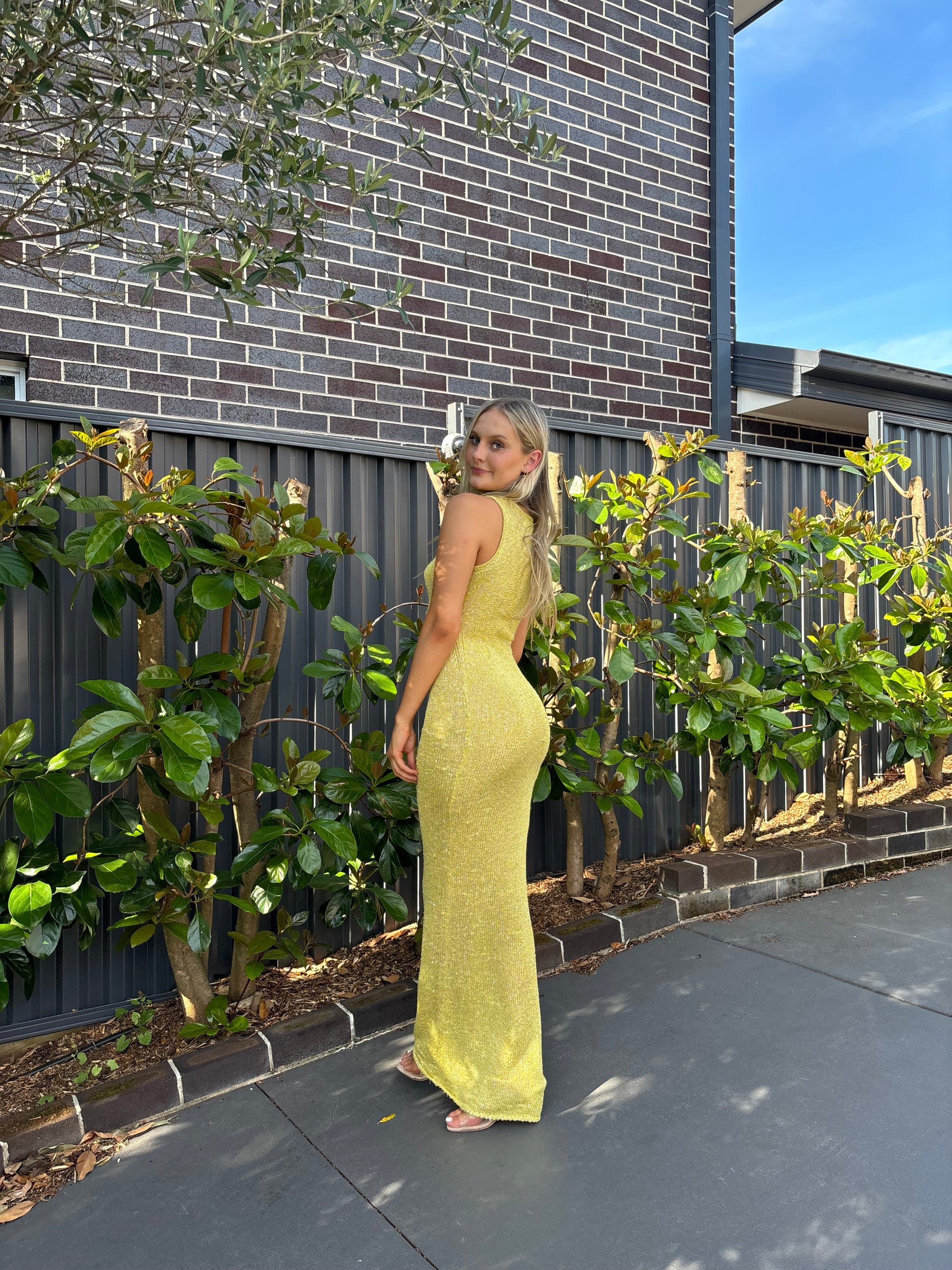 The Natalia Dress in Chartreuse Sequin by ASTA RESORT is a show-stopping, floor-length piece designed to turn heads. Crafted from a lustrous cotton-based knit and adorned with micro sequins throughout, it offers a shimmering, semi-sheer finish with light stretch for a flattering fit.
