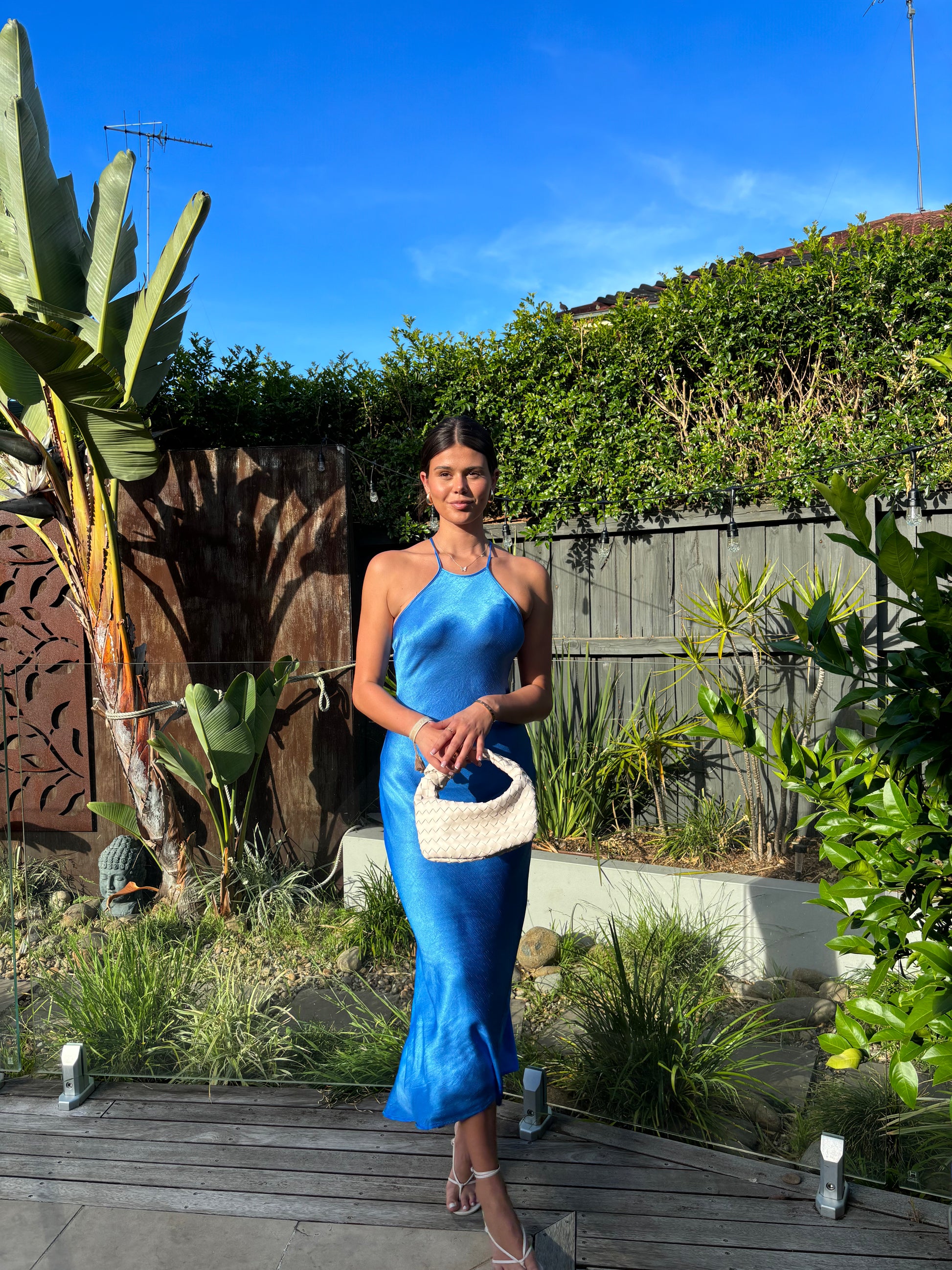 A show-stopping silhouette made for warm nights and unforgettable moments. This halter-style maxi dress features a sleek, figure-skimming fit with a high neckline and a dramatic open back. The delicate tie detail allows for adjustable comfort, while the bias-cut design enhances its fluid drape.