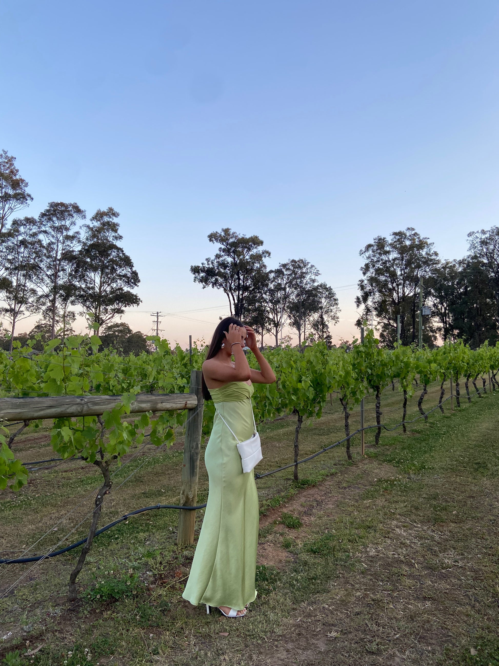 The Bec + Bridge Julieta Dress in Green is a chic and flattering event-wear piece. Crafted from 100% polyester, this maxi dress features a detailed twisted bandeau, thin rouleau straps, and a high side leg split. Designed to be fitted at the bust and hips, it offers a slightly loose fit through the skirt. The fabric provides no stretch, and the dress is accessed via an invisible zip at the back.