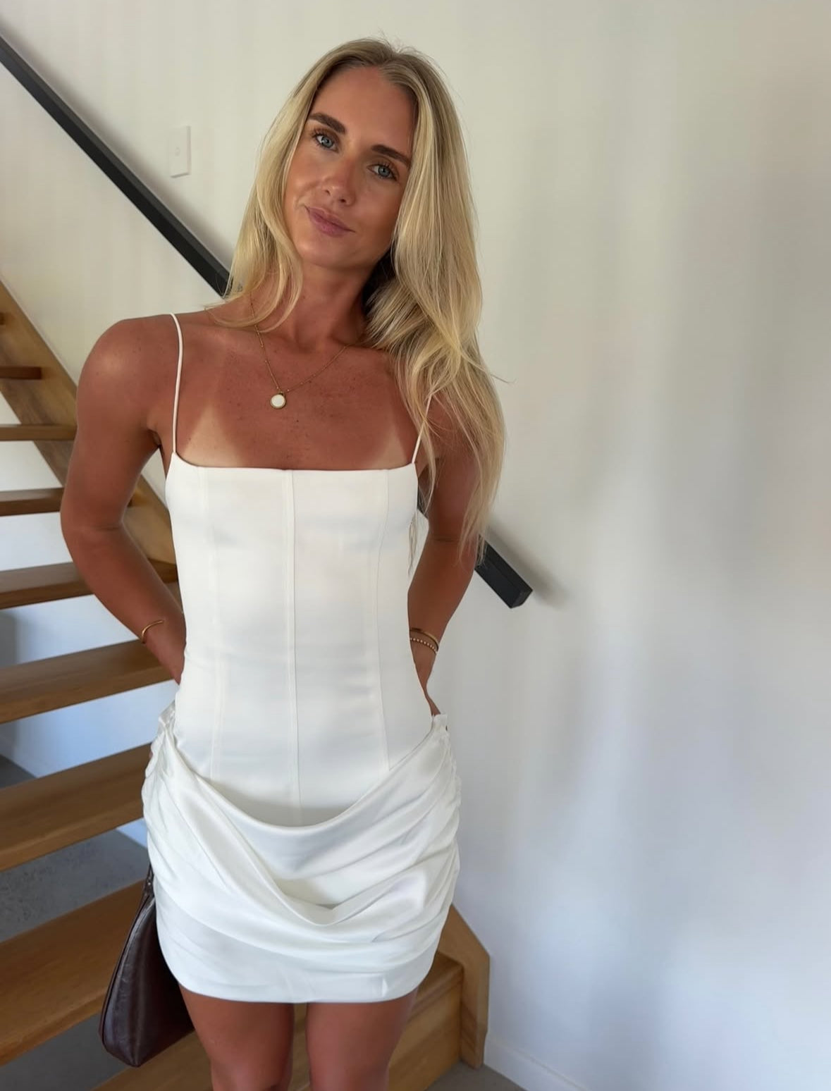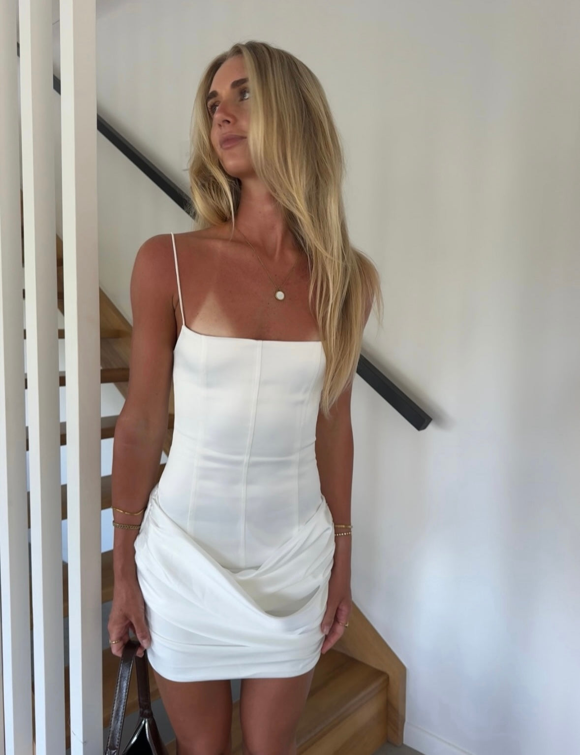 The Joel Mini Dress features a structured bodice with panel detailing for a contoured fit, a scoop neckline, and thin spaghetti straps. Draped skirt panels add movement and shape.