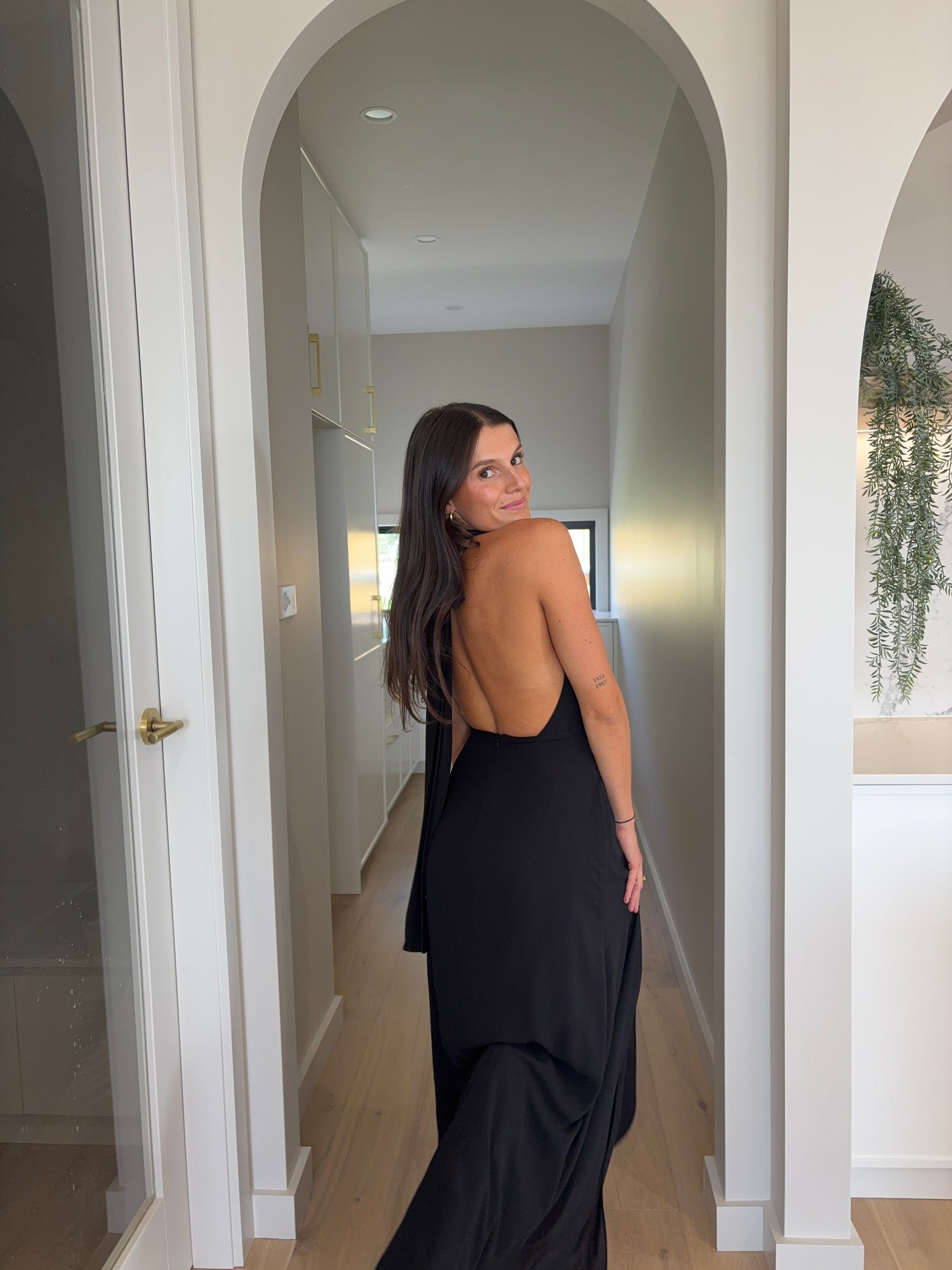 The Calia Collection Antonia Dress in Black is an elegant piece, perfect for formal events or special occasions. The dress features a plunging halter neckline, pleated detailing at the waist to accentuate the feminine silhouette, and a thigh-high leg split for added allure.