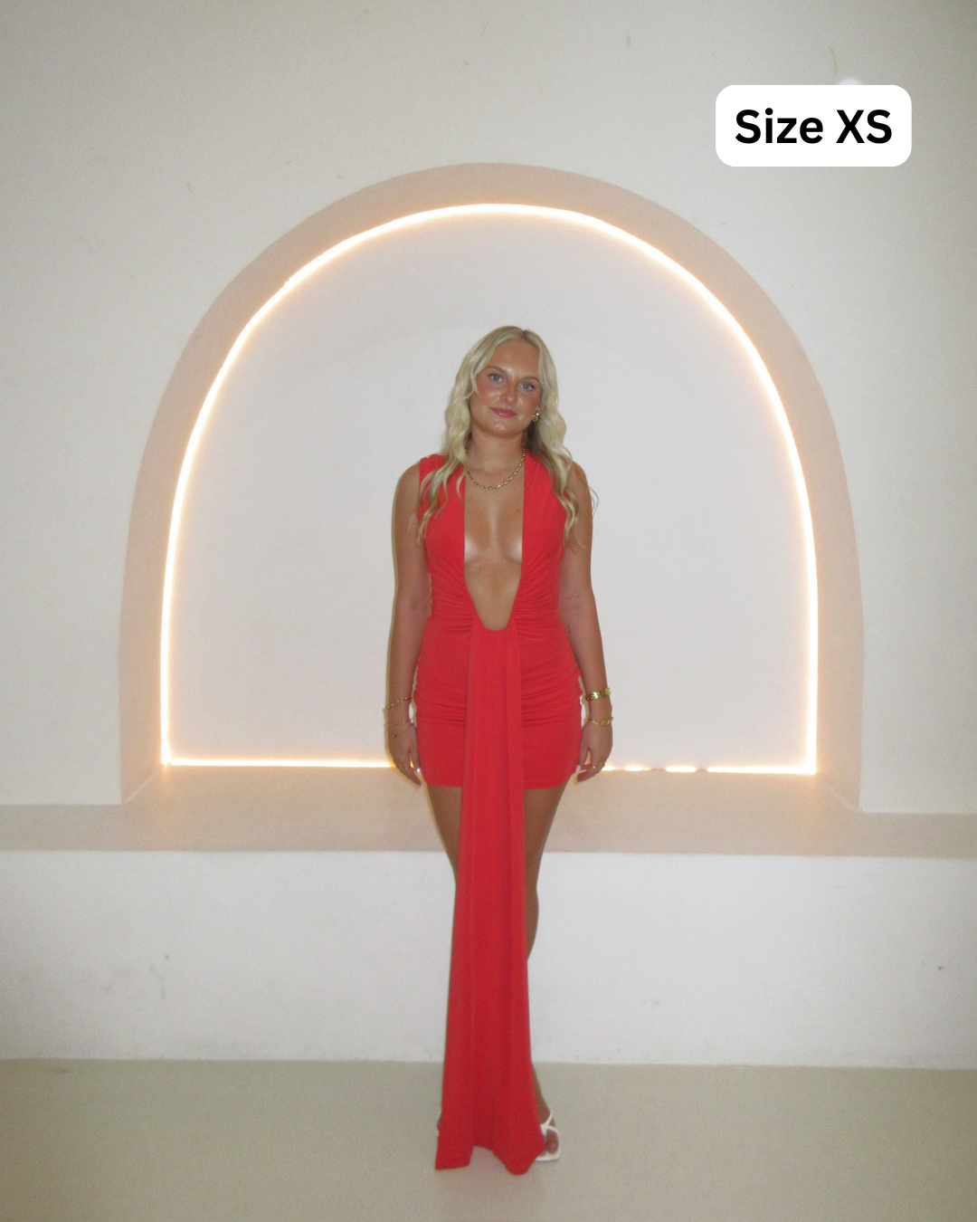 The Misha Jennifer Cupro Mini Dress in red is a bold and captivating piece designed for those seeking a striking look. Featuring a plunging halter neckline with adjustable wire, cap sleeves, and a waterfall sash extending from the waist, this dress offers a slim-fit silhouette that accentuates the figure.