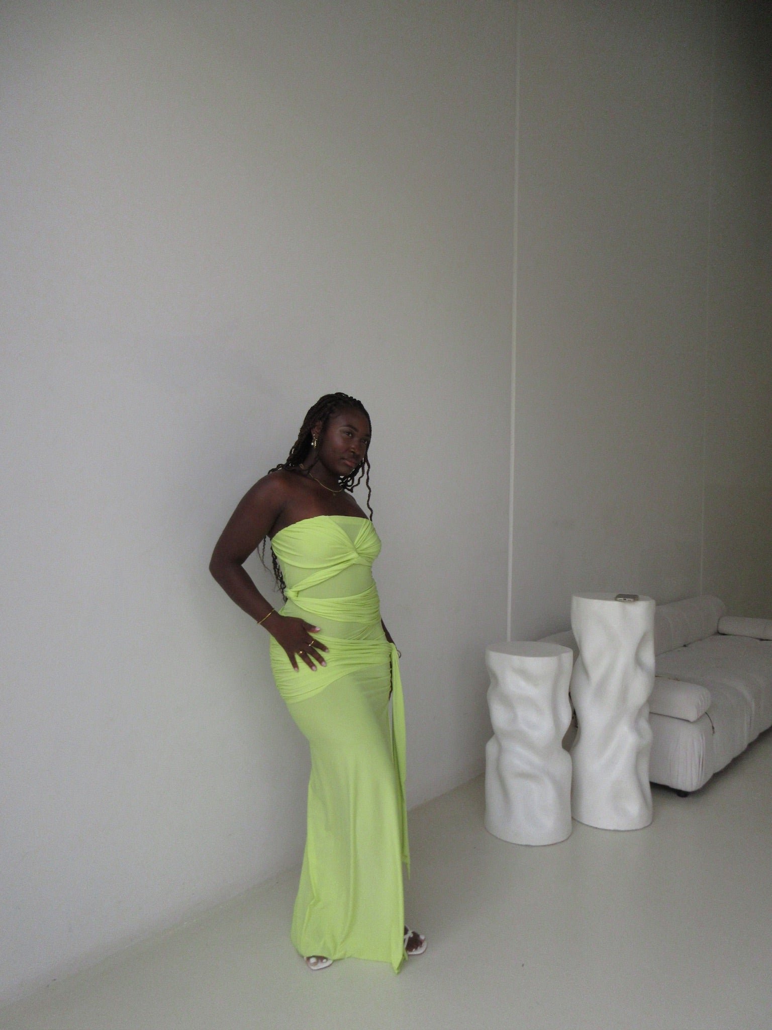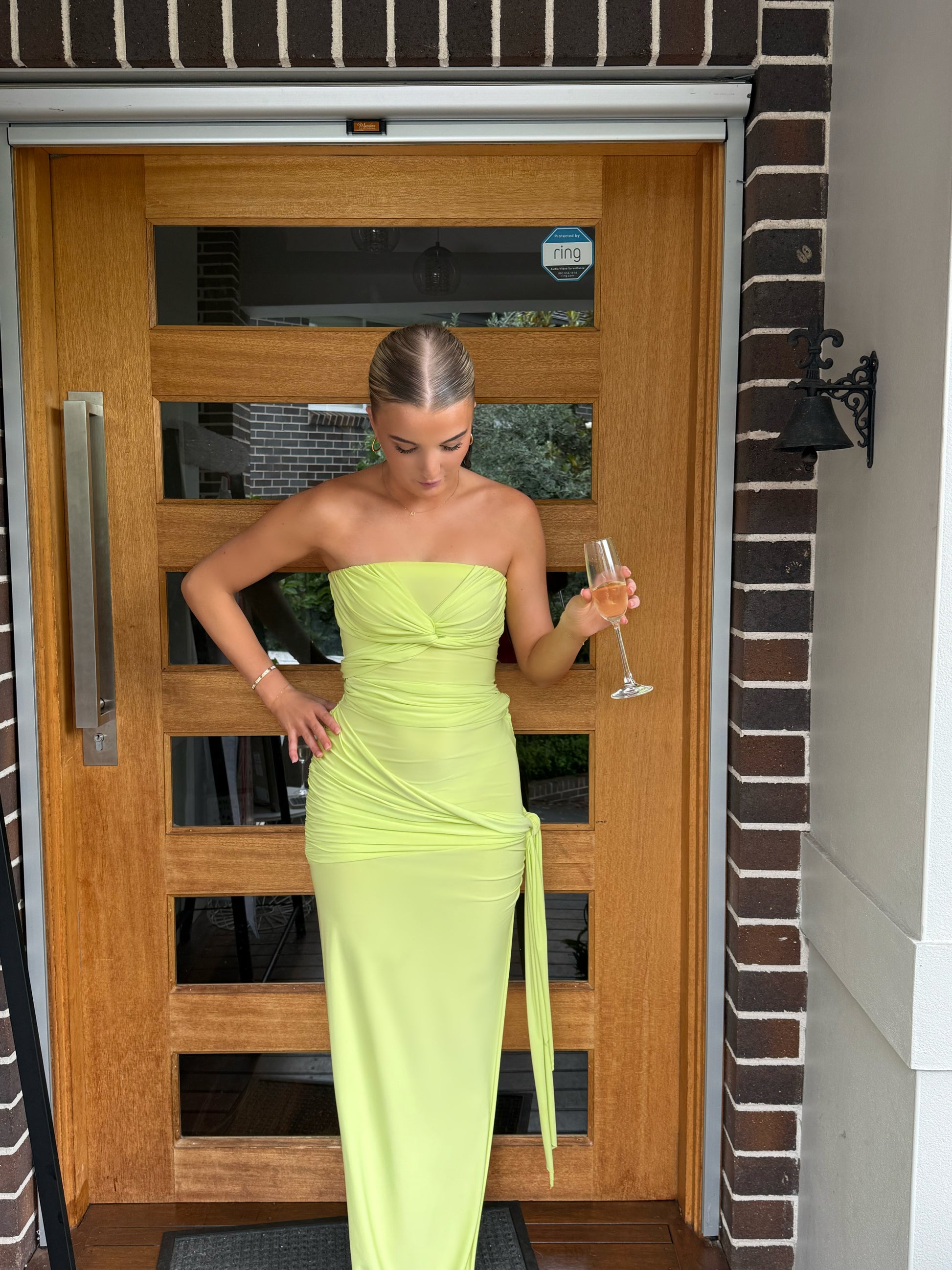 The Miranda Gown is a sculpted strapless design crafted to accentuate and contour your figure. Featuring high-density elastic along the top edge for a secure fit, knot detailing, and gathering with ruching, it offers both elegance and structure. The gown includes elongated, adjustable ties, a leg split, and a laser-cut hemline for a polished finish.