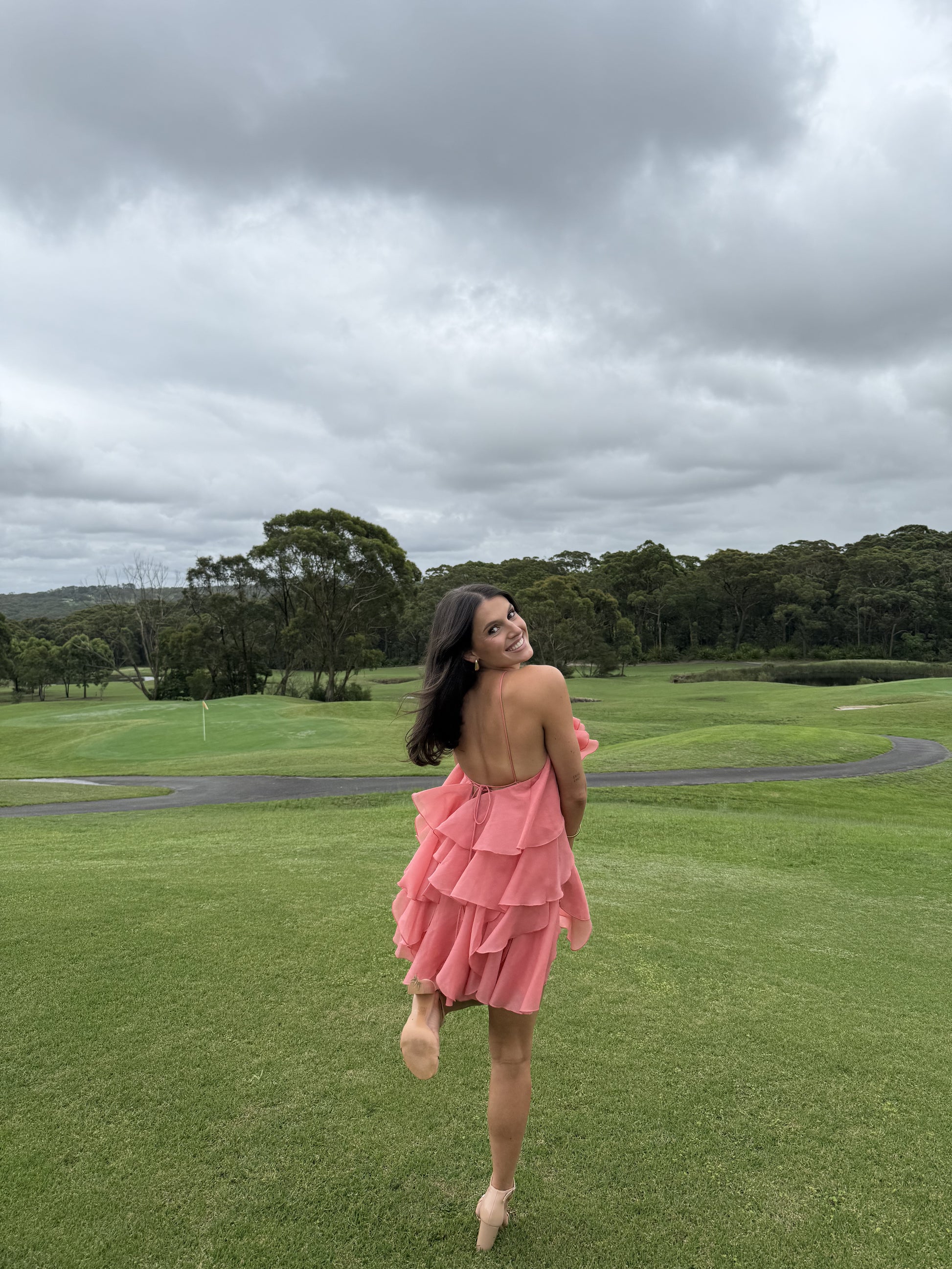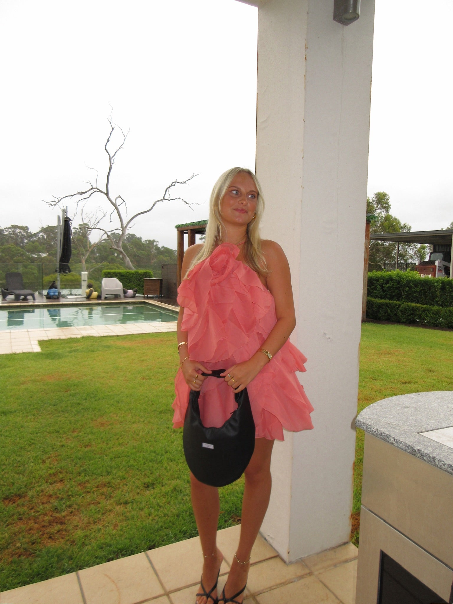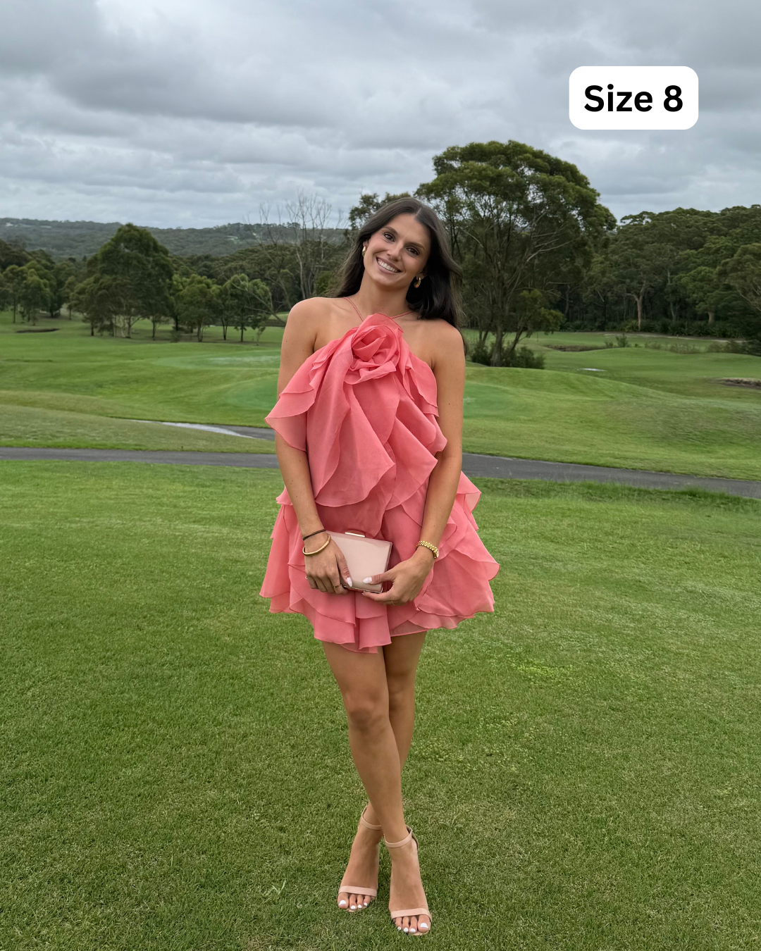 The Aje Pandorea Layered Mini Dress in Washed Coral is a statement piece that combines elegance with a playful edge. Crafted from 100% polyester, it features a voluminous silhouette with cascading ruffles throughout, a halter neckline, and adjustable straps with back ties for a customizable fit. The dress is fully lined, ensuring comfort and coverage.
