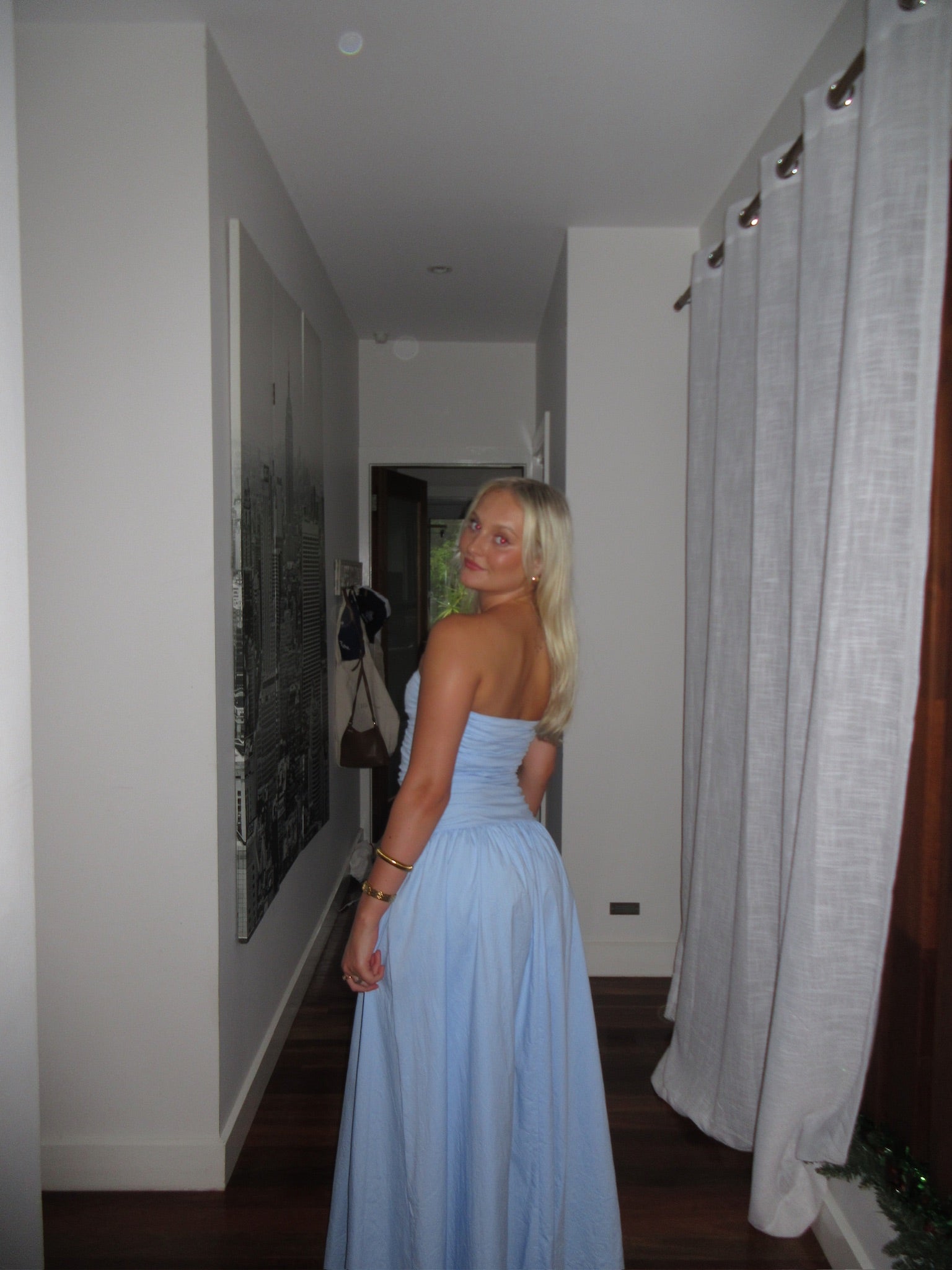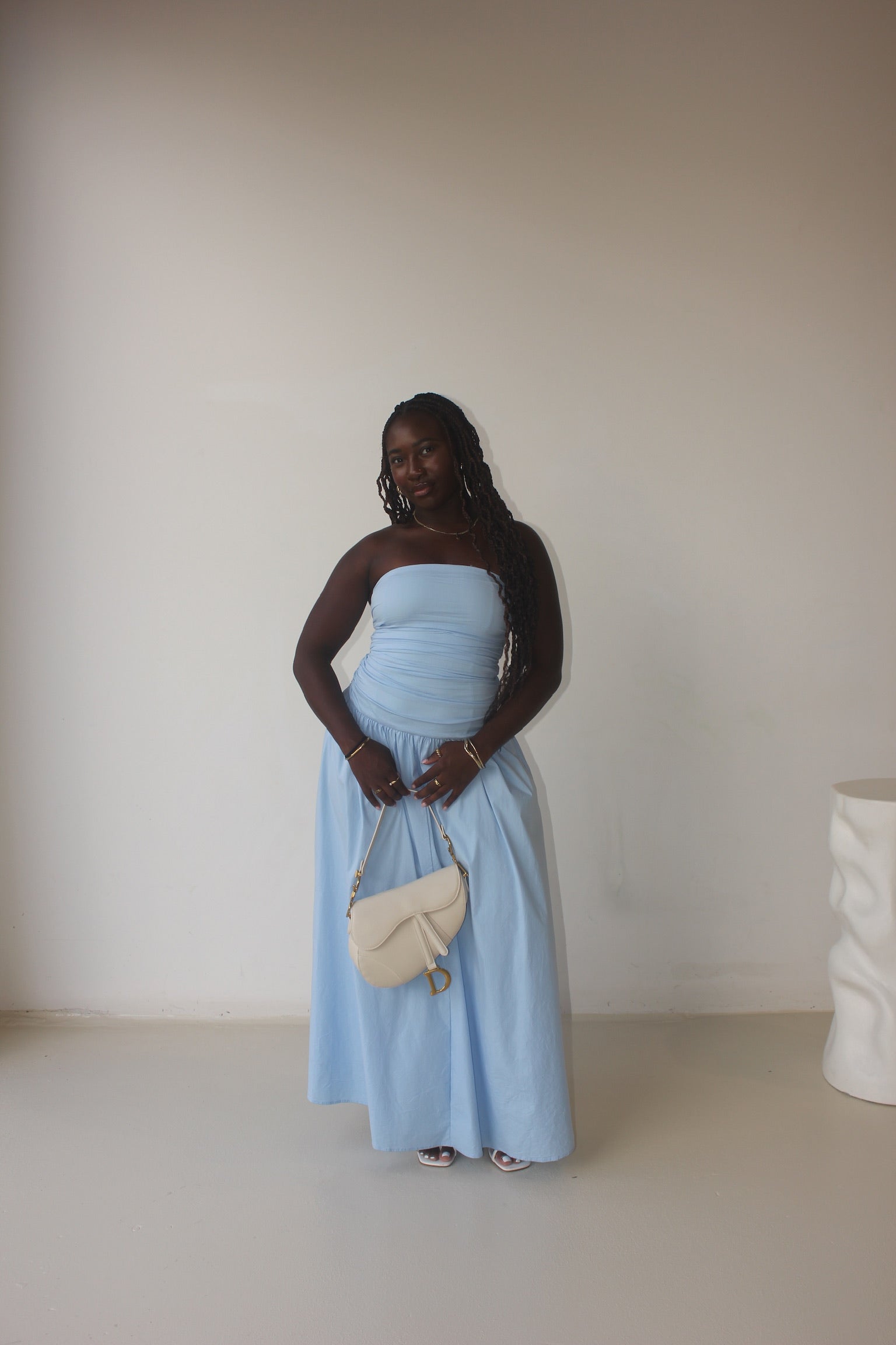 The Carmel Maxi Dress, designed to make a statement with its strapless neckline and ruched bodice detailing. Exuding sophistication and charm, this dress features a full A-line skirt, side seam invisible zipper, and silicone taping for a secure fit. Fully lined, it’s the perfect choice for an elegant evening under the stars.