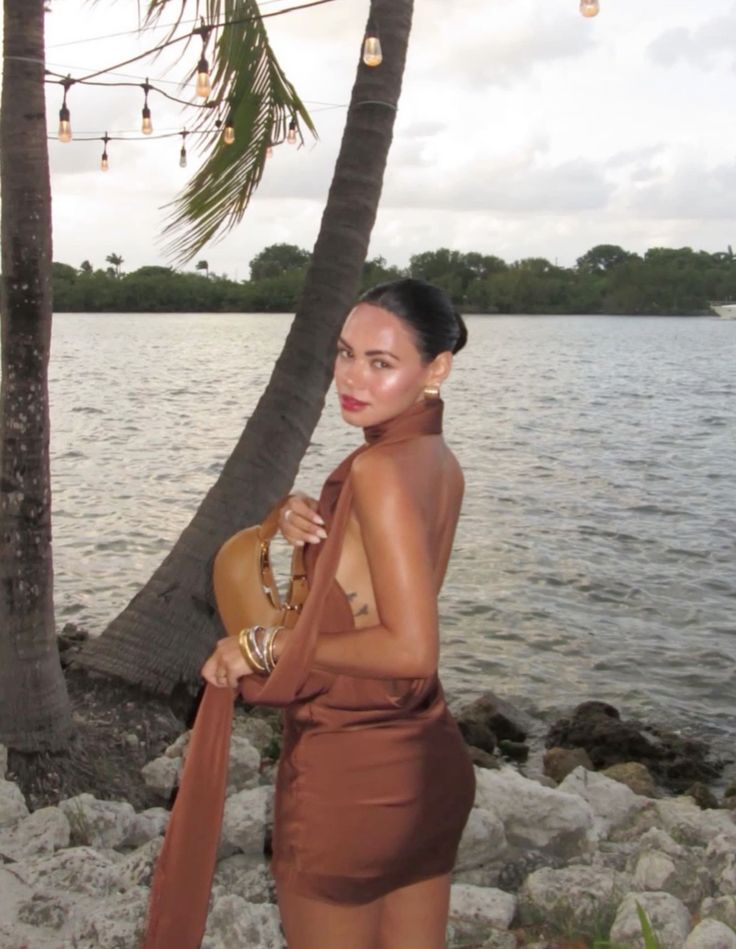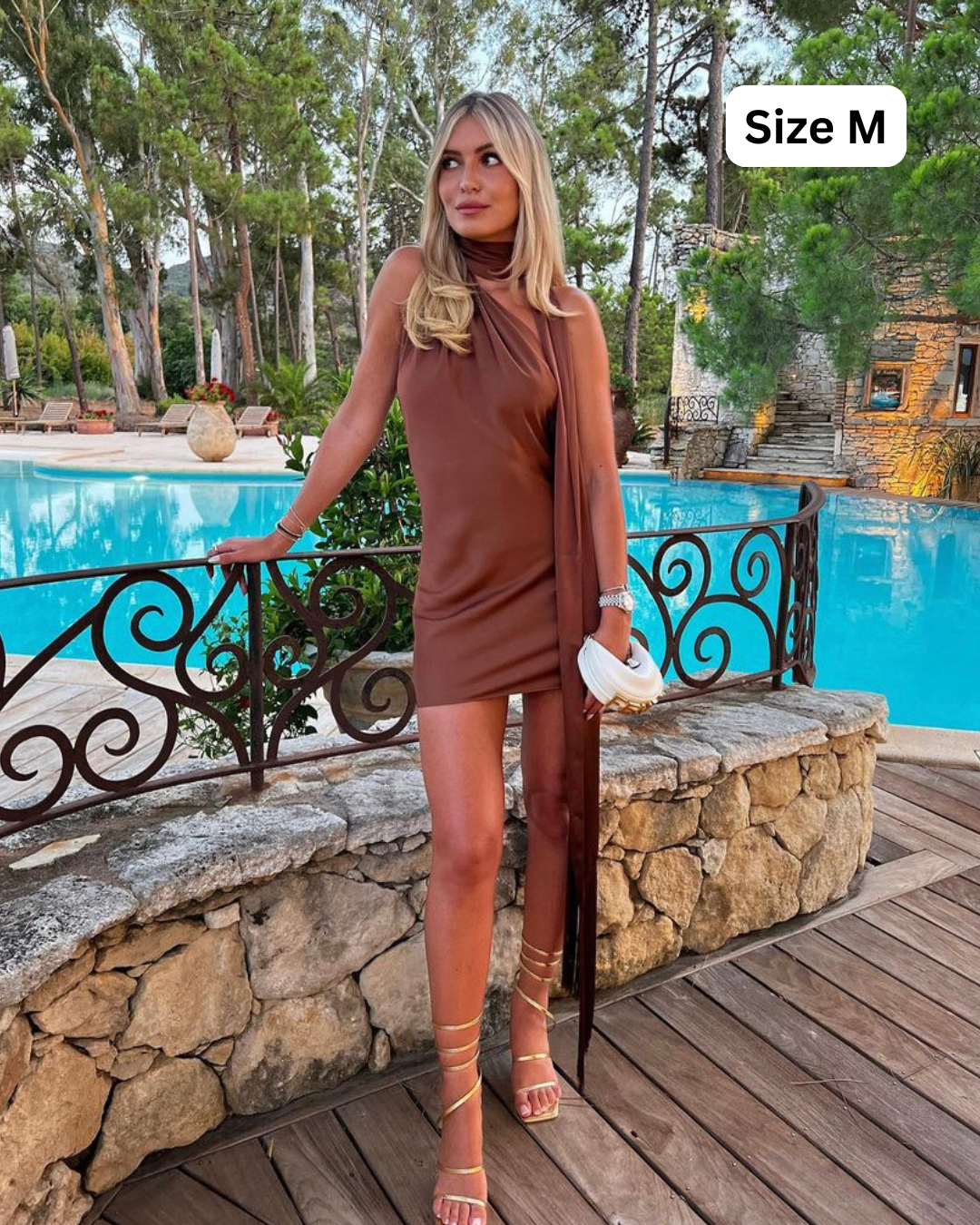 A slinky one-shouldered mini dress with our signature cowl back, the Serafia in cocoa has an elegantly-tasselled scarf that you can wrap around you in ways that are only limited by your imagination.
