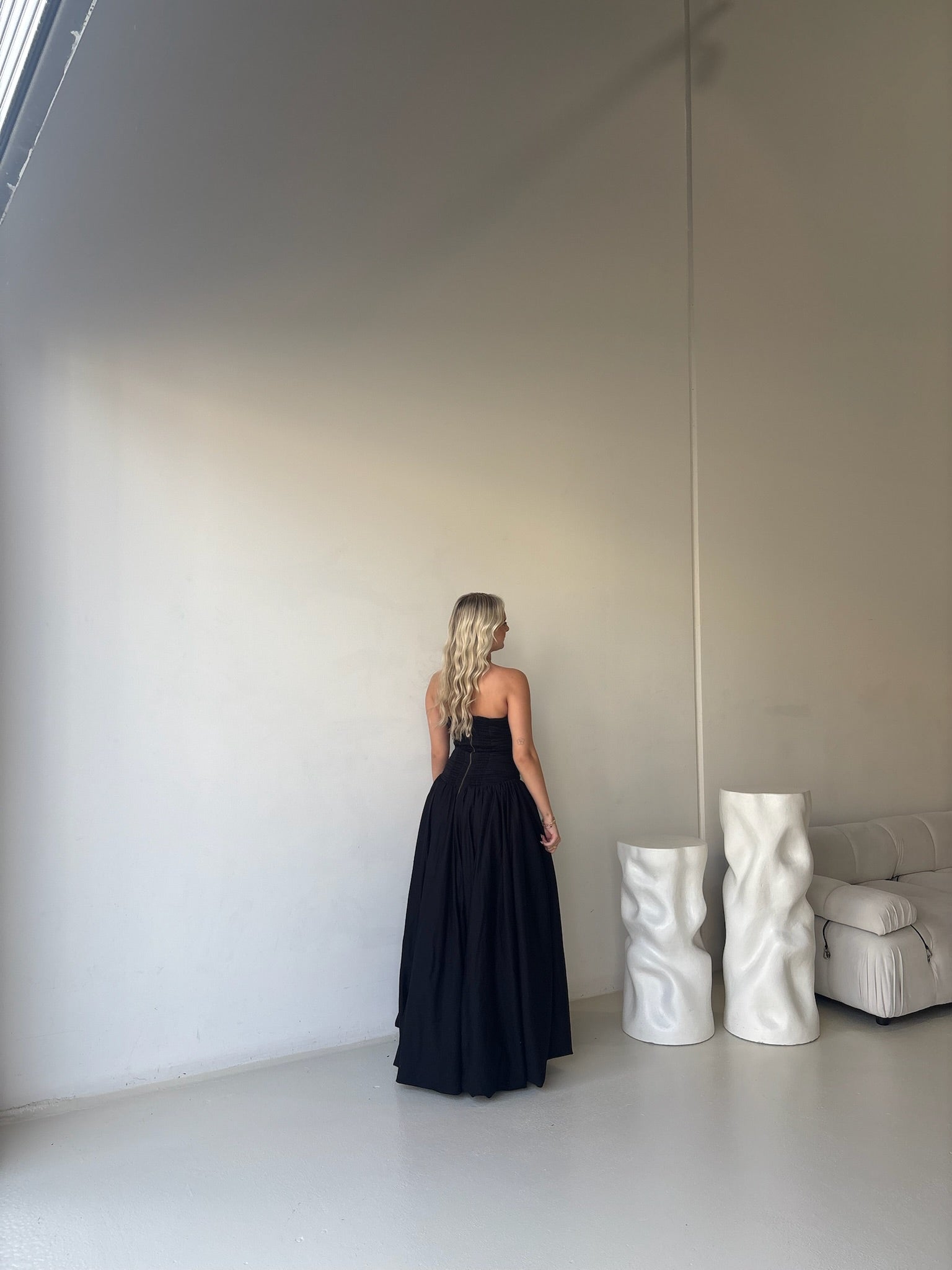 The is a striking strapless gown that combines classic elegance with contemporary flair. Featuring a straight neckline and a fitted, ruched bodice, the dress transitions into a voluminous, draped skirt with an asymmetrical bubble hem. Crafted from 100% cotton, it offers both structure and movement, making it ideal for formal occasions. The dress includes a zip and hook-and-eye closure and is fully lined for comfort.