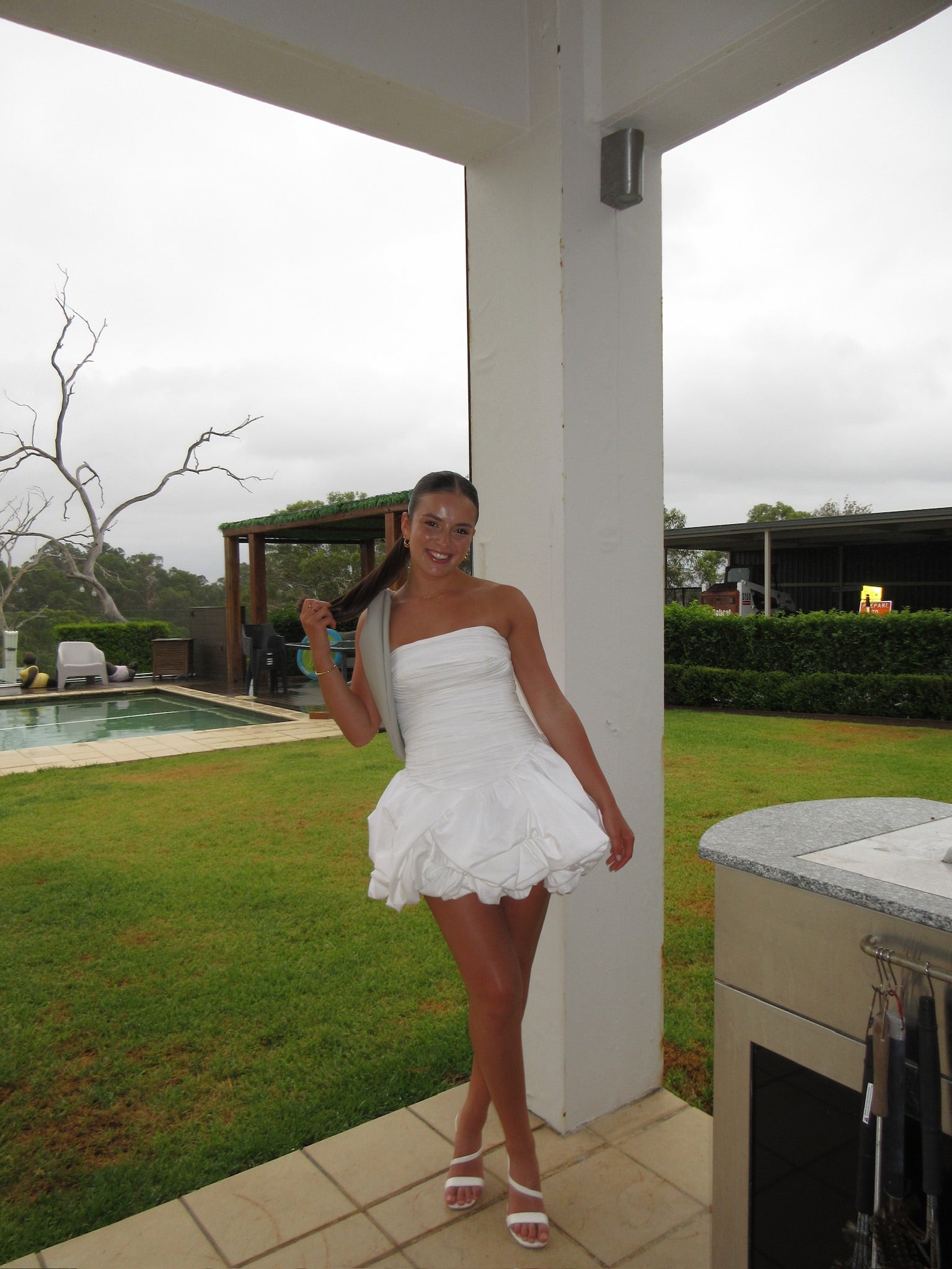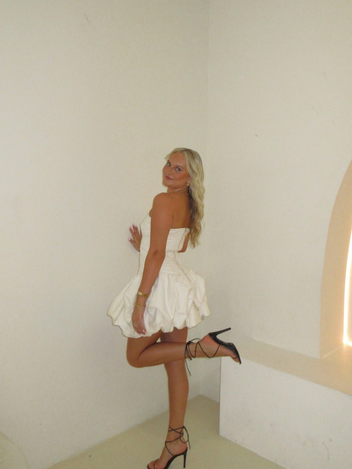 The Aje Violette Bubble Hem Mini Dress is a striking strapless piece that combines a fitted, ruched bodice with a voluminous bubble hem skirt, creating a playful yet elegant silhouette. Crafted from 100% cotton, this dress features a straight neckline, external back zip, and is fully lined.